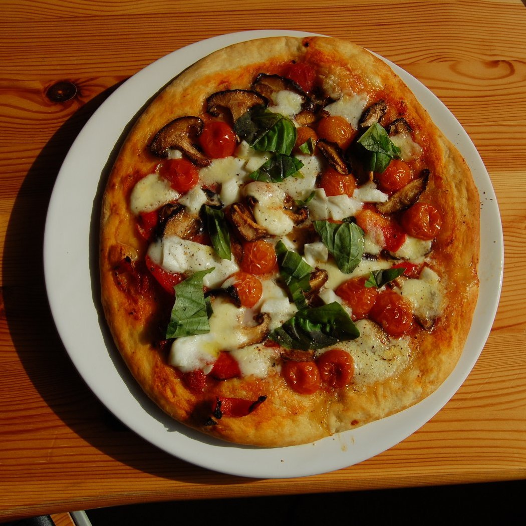 You’ll have to prepare the dough yourself and to bake it at home. Of course this is cumbersome, and that’s where technology comes handy: I had friends for dinner last Saturday, and we used my bread-making machine to prepare the dough. Then we stopped it before it started baking, took it out, added some flour and prepared the pizza base. The result was quite interesting…